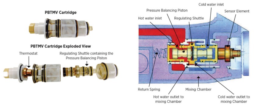 At the respective inlets and outlets of the regulating shuttle, the internal pressure balancing piston balances the amount of incoming hot and cold water that is able to enter the mixing chamber. Simultaneously the thermostatic sensor element both monitors and adjusts the regulating shuttle’s position to cover the hot water outlet to the mixing chamber, preventing scalding.