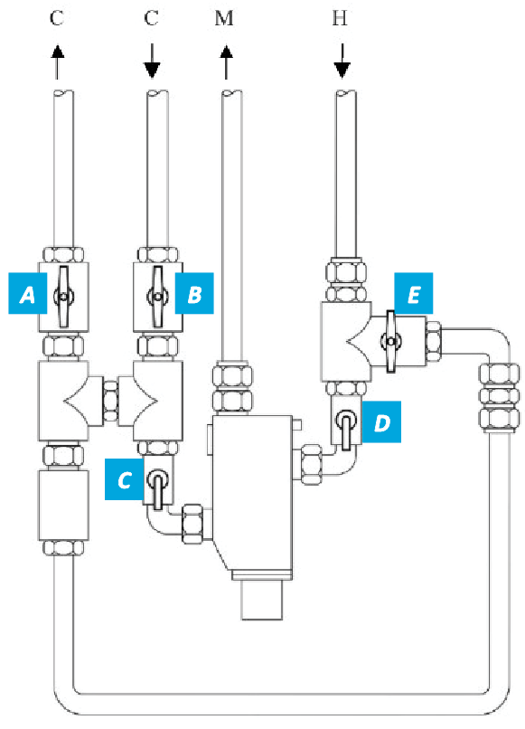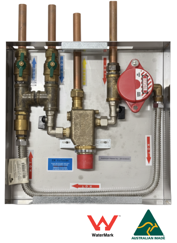 FM Mattsson Pressure Balanced Thermostatic Mixing Valve (PBTMV) with patented warm and cold water pipework thermal flush system suitable for use with showers, basins and baths. The PBTMV box includes multiple isolating valves to deliver flushing operations and disinfection through both the warm and cold water outlets to reduce the risk of Legionella and other bacteria between the valves and outlets.
